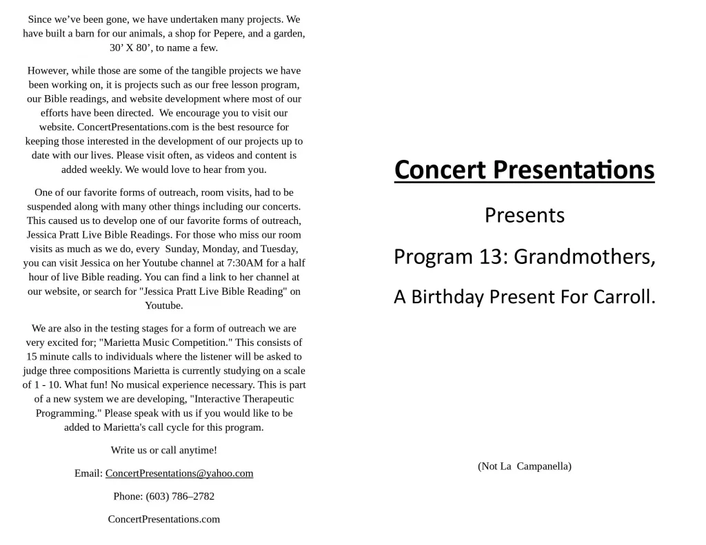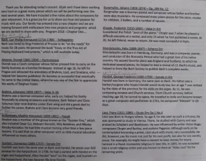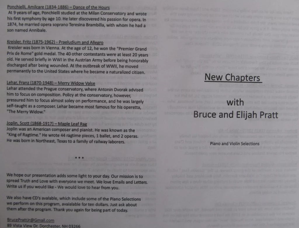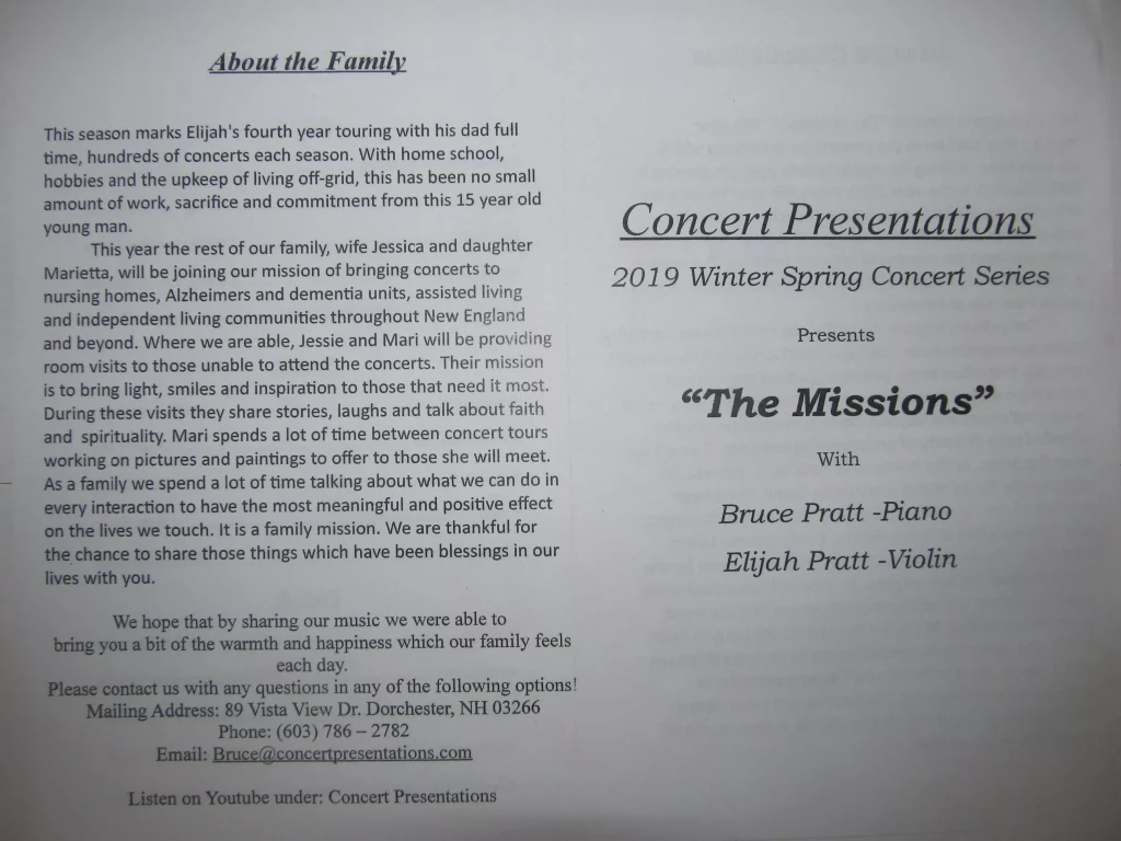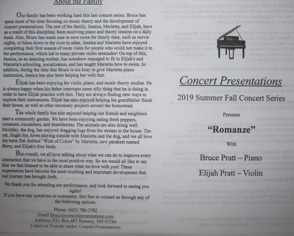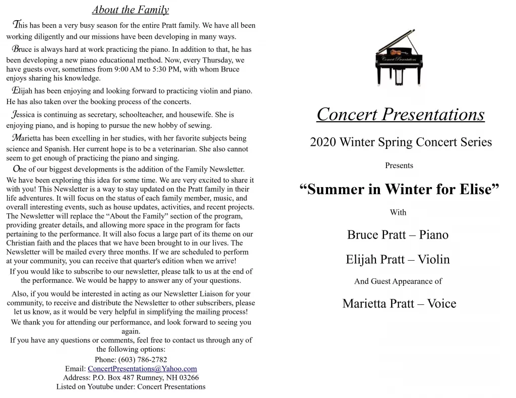 “Summer in Winter for Elise” was the official debut of the Pratt Family Newsletter, Family Missions. The newsletter was necessary because we had run out of room for both information about the selections and the About the Family section in the program. This program was also not able to be fully performed, due to the grand entrance of Covid 19.
