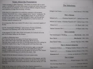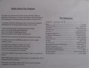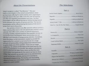 “Programs one, two, and three represent a three year project. The intent of this project is to create three themed concert programs. The intent of these themed programs is to allow an audience to connect more closely with the music and the musician than current concert etiquette allows. My desire is to create classically based concerts that are, generally speaking, more appealing and more accessible to the general public.